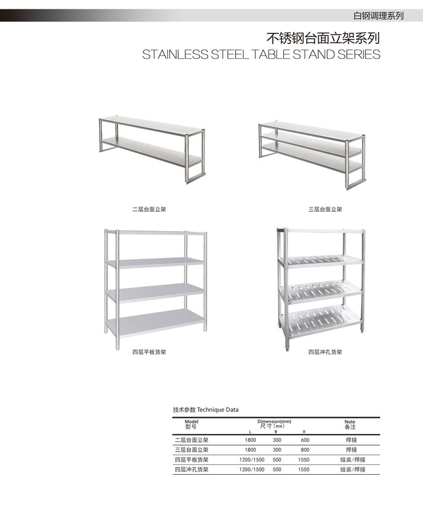 不銹鋼工作臺系列--二層臺面立架-三層臺面立架-四層平板貨架-四層沖孔貨架
